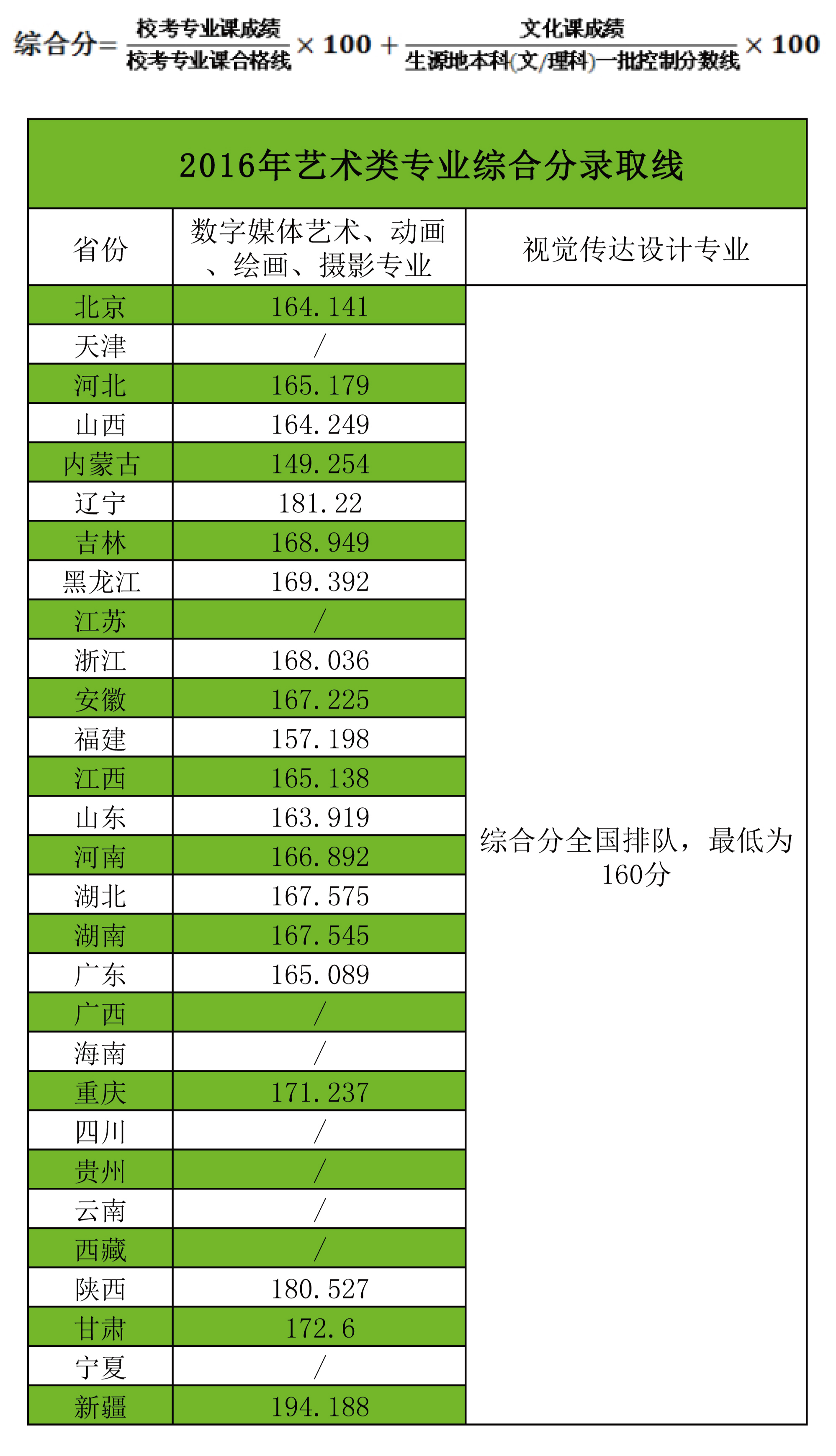 艺术类专业2016年综合分录取线